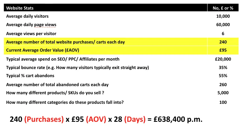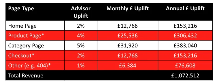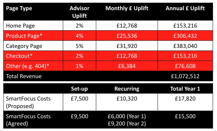 Each uplift was calculated separately, then rolled up into monthly and annual potential revenue figures – because no only do bigger numbers sell better, but because buyers have monthly and annual targets in mind.