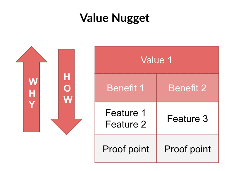 A value nugget is a way to package up your product features and benefits, while providing a clear hierarchy to navigate effortlessly in sales conversations and marketing.